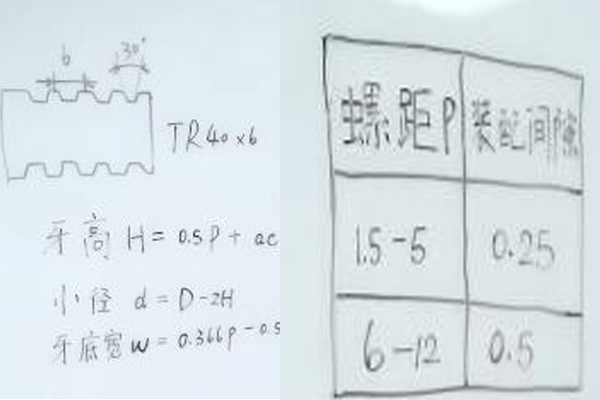 梯形螺紋怎么計(jì)算?今天我們一起來看一看,首先TR代表梯形螺紋,40表示大徑,6為6個螺距,角度為30,已經(jīng)知大徑為40,螺距為6,此時牙高H=0.5p+ac,其中ac表示裝配間隙,接下來我們再來看小徑d等于大徑減去兩倍的牙高,最后看一下牙底寬,W=-0.366p-0.536ac,同樣ac表示裝配間隙,那在這里我們可以看到螺距p和裝配之間的關(guān)系是當(dāng)螺距p為1.5-5時,裝配間隙為0.25,當(dāng)螺距p為6-12時,裝配間隙為0.5。