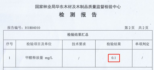 甲醛釋放量檢測報告:釋放量0.1mg/L
