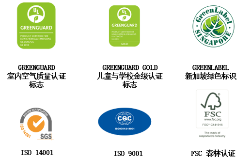 瑞欣產(chǎn)品嚴(yán)格按照ISO 9001 質(zhì)14001環(huán)境管理體系認(rèn)證,同時,瑞欣產(chǎn)品擁有GREENGUARD室內(nèi)空氣質(zhì)量認(rèn)證、GREENGUARD GOLD兒童與學(xué)校金級認(rèn)證,新加坡GREENLABEL等綠色環(huán)保權(quán)威認(rèn)證,且為FSC認(rèn)證企業(yè) ,瑞欣產(chǎn)品多項環(huán)保認(rèn)證可為LEED建筑加分。