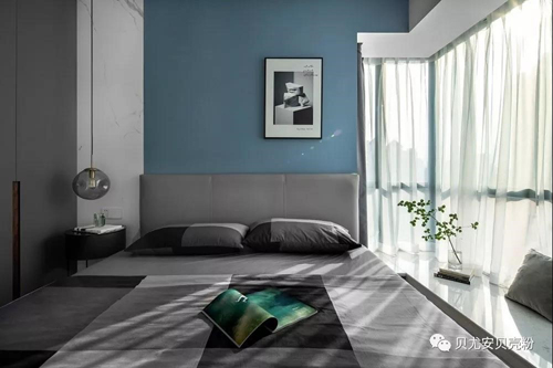 次臥床頭背景墻上海藍加閃藍調(diào)色搭配可以安撫身心疲憊,搭配淺藍色和中性灰色床品,色彩兼容,整體清新自然。
