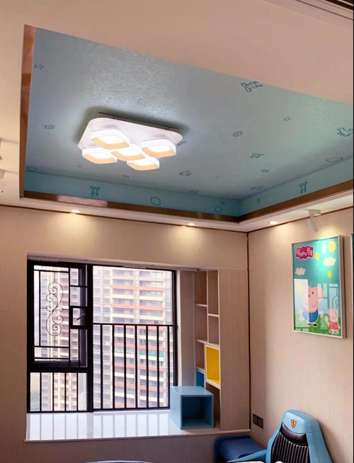 兒童房,用彈涂澗石藍做天花凹凸感加卡通圖案布藝給人可愛溫馨的感覺,簡潔的布局營造一派熱鬧的田園美景中弱化了繁雜的感覺,沿海一帶濕氣重,用上貝殼粉涂料可以達到防霉防潮的效果,減少小朋友因氣候多變所引發(fā)的感冒、發(fā)燒、過敏等問題。