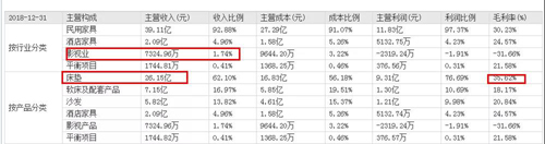夢百合2018的營收中主要處于家居用品行業(yè),超過一半的營收的來自于記憶棉床墊,其余營收最多的產(chǎn)品是記憶棉枕,產(chǎn)品的毛利率在30%左右。