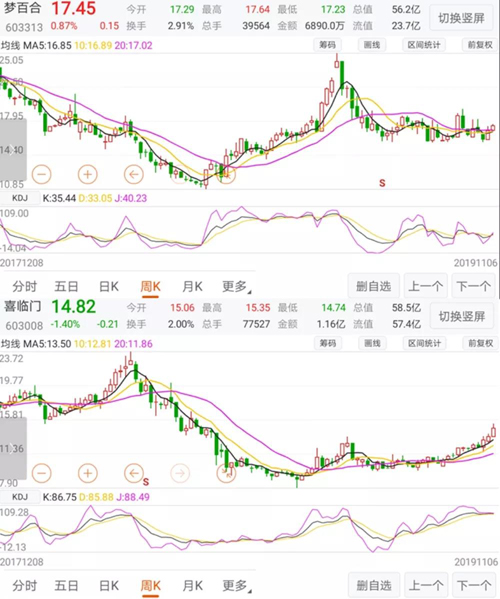 從周k線上來看(數(shù)據(jù)時間11月6日收盤后),二者都處于歷史中低位水平,尤其是喜臨門。