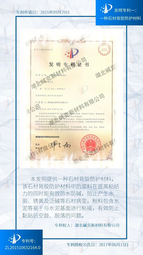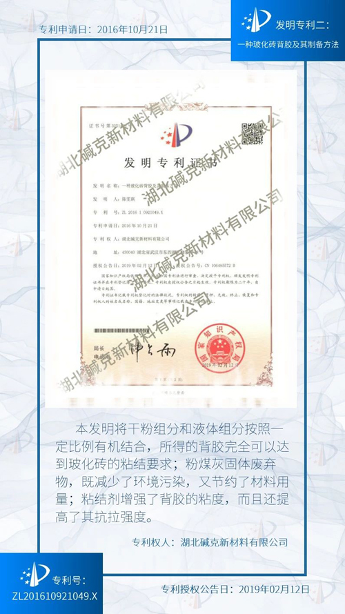 截至2019年12月,湖北堿克公司已申報國家專利26項,其中已獲得專利授權(quán)5項,其中瓷磚背膠發(fā)明專利4項、外觀設(shè)計專利1項,彰顯了湖北堿克公司在瓷磚鋪貼等相關(guān)領(lǐng)域的強大技術(shù)實力和核心競爭力。