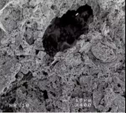 新型瓷質(zhì)磚表面致密、無(wú)空隙,傳統(tǒng)的粘貼材料和工藝無(wú)法滿足要求,原因在于原先陶質(zhì)磚表面為多孔結(jié)構(gòu)(圖1所示),水泥漿體可以滲入這些孔隙中形成機(jī)械錨固作用粘接。但瓷質(zhì)磚表面無(wú)孔隙,傳統(tǒng)水泥砂漿無(wú)法形成機(jī)械錨固對(duì)其粘接(圖2所示)。