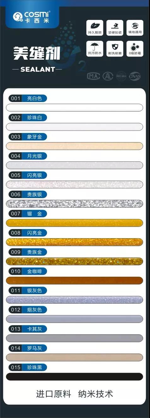 美縫劑既可以美化縫隙,又可以防水防霉防止藏污納垢,同時(shí),美縫劑+瓷磚的色彩搭配也是至關(guān)重要的,搭配對(duì)了,不但彰顯主人家的品位,也讓家更加賞心悅目!日前卡西米新品美縫劑上市,很多業(yè)主也有反映要怎么選擇顏色。