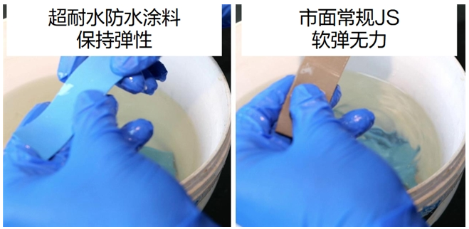2、高彈抗裂特性:浸水后拉伸強(qiáng)度保持率高,具備優(yōu)異柔韌性。經(jīng)過性能測試發(fā)現(xiàn),萃優(yōu)超耐水與市面普通JS經(jīng)過浸水14天處理后,進(jìn)行繞圈斷裂測試,發(fā)現(xiàn)市面普通JS變得軟彈無力,反而彩色超耐水柔性防水涂料仍保持良好的彈性。所以無論是夏季高溫還是水池輕微沉降,涂層均能自適應(yīng)伸縮,有效彌合細(xì)微裂縫。