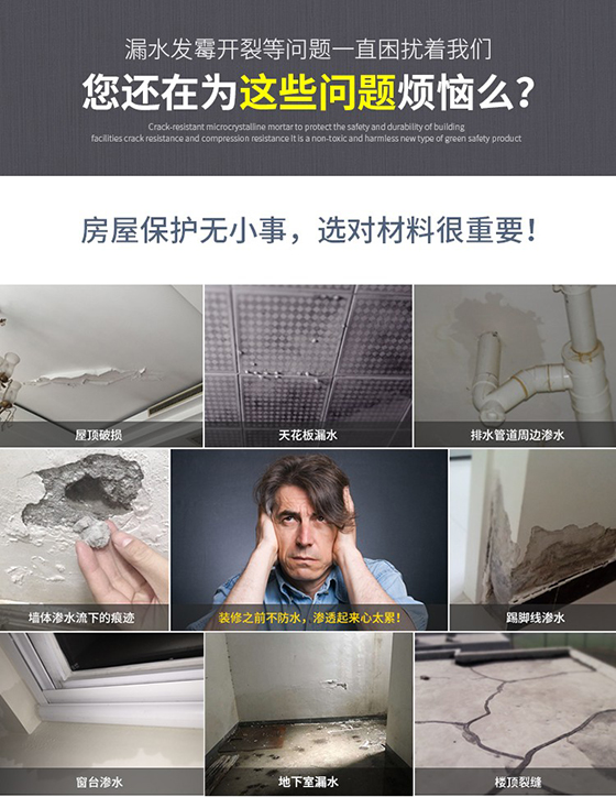 公司創(chuàng)始人聯(lián)合多所大學(xué)地下建筑和工程系研發(fā)出來的微晶,本質(zhì)上是一種高科技的防水材料。在使用的時(shí)候,微晶需要摻入水泥中。在水泥的水化過程里,它能夠有效排出多余水分、封閉水泥內(nèi)部的裂縫,形成水化石。微晶無毒、無害,也不會對環(huán)境造成什么污染,一次施工之后,有效期長達(dá)20年。一次施工,能夠保證一個(gè)家庭在二十年內(nèi)不需要對防水工程進(jìn)行任何維護(hù),堪稱一勞永逸。微晶的出現(xiàn),必然會大幅度地改變家居裝修中防水工程的施工方式,讓更多的家庭擺脫潮濕和滲漏,過上更健康、更舒適的家居生活。