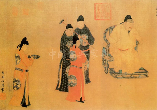根據(jù)元朝畫家任仁發(fā)所畫的《張果老見明皇圖》,可以明顯看出,唐明皇正是坐在一張裝飾華麗且?guī)в心_踏的圈椅之上。此外,五代時(shí)期的周文矩所畫的《宮中圖卷》也同樣出現(xiàn)了圈椅的形制?梢娫谔颇┲廖宕陂g,隨著座椅的升高,之前在席地而坐時(shí)用來依靠的憑幾,已經(jīng)悄悄地演變成圈椅的樣子出現(xiàn)在宮廷之中。