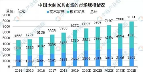 隨著中國(guó)穩(wěn)定的宏觀經(jīng)濟(jì)環(huán)境持續(xù)增長(zhǎng)的收益,中國(guó)木業(yè)家具市場(chǎng)規(guī)模穩(wěn)步增長(zhǎng)。2019年中國(guó)木業(yè)家具市場(chǎng)規(guī)模6372億元。預(yù)計(jì)2024年市場(chǎng)規(guī)模將達(dá)到7814億元。