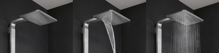 Infinity | 意飛霖高奢淋浴系列采用大尺寸的柔角方形設(shè)計,彰顯扎實厚重氣質(zhì)。自然水源般靈活的出水模式,帶來暢快淋漓的多方位淋浴體驗。寬度360mm的長方形頭頂花灑使水流更好覆蓋雙肩,并帶有澎湃瀑布出水及細(xì)密柔和雨淋雙模式。瀑布式上、下出水方式,呈現(xiàn)活力水流,潤徹全身肌膚:“上瀑布”令您仿佛置身于舒爽凈澈的自然瀑流之下,“下瀑布”則如同河流中戲水。雨淋模式則可柔和覆蓋大部分軀體。130mm寬的手持花灑配備三種不同出水模式,實現(xiàn)極致清潔溫潤:晶純出水,水流平穩(wěn)柔和、晶瑩剔透,適合手握集中沖洗身體部位;柔和雨淋,以密集細(xì)柔水柱帶來大面積滋潤,置于支架上更便于秀發(fā)沖洗;交替按摩,以左右交替的強(qiáng)勁激流實現(xiàn)按摩性能,喚醒活力身心。