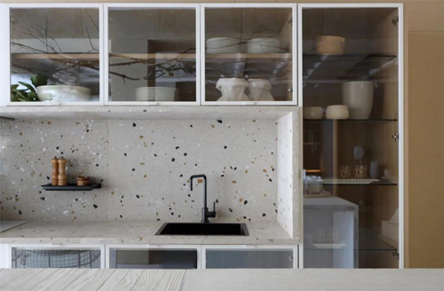 廚房的花崗巖框架桌子是Juliana Pippi為項(xiàng)目專門設(shè)計(jì)的。自然色調(diào)的水磨石廚房背板自帶復(fù)古感與工業(yè)感。
