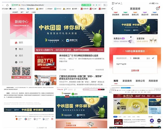 中秋期間,配合“中秋團(tuán)圓 伴你回家”聯(lián)名推廣活動(dòng),兔寶寶在搜狐、天貓、騰訊、新浪、房天下等多個(gè)媒體平臺(tái)上線活動(dòng)優(yōu)惠畫面,多平臺(tái)搶占流量高地,進(jìn)一步擴(kuò)大兔寶寶中秋活動(dòng)曝光量,輻射多層次及年齡段用戶,全方位提升兔寶寶品牌影響力及品牌高度。