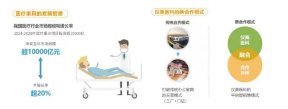 據(jù)各地發(fā)改委統(tǒng)計(jì)數(shù)據(jù),2023—2025年醫(yī)養(yǎng)重點(diǎn)項(xiàng)目總數(shù)1490個(gè),總投資超過(guò)10000億。2023年中國(guó)醫(yī)用家具行業(yè)市場(chǎng)規(guī)模 2200億元,增長(zhǎng) 10.75%。預(yù)計(jì)到2029年中國(guó)醫(yī)用家具行業(yè)市場(chǎng)規(guī)模將超過(guò)4000億元。為迅速搶占醫(yī)養(yǎng)家具市場(chǎng),與廣大經(jīng)銷(xiāo)商及終端用戶合作共贏,儀美醫(yī)科還推出了創(chuàng)新的“平臺(tái)型銷(xiāo)售模式”,與家具行業(yè)傳統(tǒng)的“工廠+門(mén)店”營(yíng)銷(xiāo)模式相比。儀美醫(yī)科的平臺(tái)型銷(xiāo)售模式可以全方位提供醫(yī)用家具工程解決方案,包括醫(yī)用家具設(shè)計(jì)、定制、生產(chǎn)、安裝和售后服務(wù),以滿足不同醫(yī)療機(jī)構(gòu)的需求。