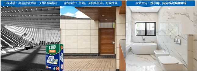 超柔大板瓷磚膠產(chǎn)品適用于室內(nèi)外多元場(chǎng)景,可以充分滿足現(xiàn)代高端家裝及高端裝修工程鋪貼大磚或大規(guī)格巖板的需求: