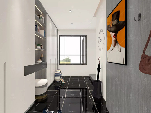 入門是黑色拋光瓷磚搭配雅致白頂柜,鞋柜隱藏其中,令整體空間簡(jiǎn)潔大方;開放區(qū)擺放配飾和和收藏物,搭配鮮艷色彩墻畫,點(diǎn)綴出空間靈動(dòng)感,同時(shí)也凸顯主人公的生活品味。