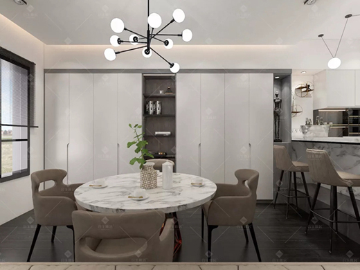 客廳與餐廳以開放式的格局,使整體空間視覺延伸;淡灰色元素點(diǎn)綴簡(jiǎn)白烤漆大頂柜,與客廳風(fēng)格更具和諧感。白色冰川大理石搭配灰色系餐椅,為餐廳增添幾分靜謐與安詳。