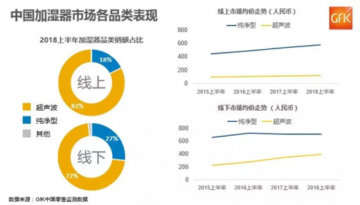 根據(jù)捷孚凱(GfK中國)零售監(jiān)測數(shù)據(jù)顯示,兩者在2018上半年零售額在線上線下占據(jù)了整體市場的95%以上。其中又以超聲波加濕占據(jù)主導(dǎo),其上半年線上線下銷額同比增長率分別為49.7%與33.5%。而純凈型雖然體量遠低于超聲波型,但其上半年線上銷額增速高達68.6%,線下從去年同期-25%市場萎縮恢復(fù)到今年上半年24.4%的增速。