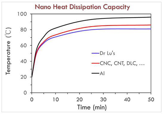圖一是不同石墨烯納米碳材的散熱能力比較圖,使用石墨烯納米碳材的LED燈,其光源溫度(紅色線)明顯低于未噴涂的LED(黑色線);至于納米碳材料本身差異影響并不大,例如納米碳球、納米碳管、或類鉆碳等;不過盧鴻智博士表示還是可以進一步提升,透過特定比例配方混和不同石墨烯納米碳材料,可以進一步降低(藍色線)。