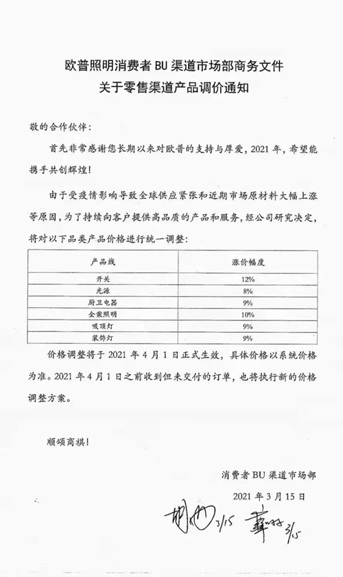 3月11日,歐普照明向各渠道分銷商及終端用戶發(fā)出《歐普照明線下事業(yè)部產(chǎn)品價(jià)格調(diào)整通知》,稱由于原材料大幅上張等原因,將對(duì)產(chǎn)品價(jià)格進(jìn)行適當(dāng)調(diào)整(漲幅約為8%-12%),價(jià)格調(diào)整將于2021年4月1日起正式生效。