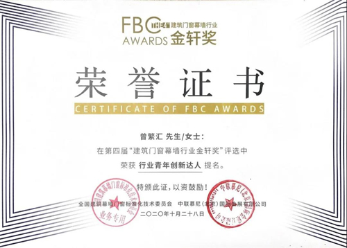 旭輝集團(tuán)總裁助理曾繁匯先生更是憑借個(gè)人在行業(yè)與產(chǎn)品創(chuàng)新上的成就,突破重重審核和選拔,最終從候選名單中脫穎而出,一舉奪得“行業(yè)青年創(chuàng)新達(dá)人”獎(jiǎng)項(xiàng)!雙“獎(jiǎng)”臨門,軒尼斯門窗可謂實(shí)至名歸!