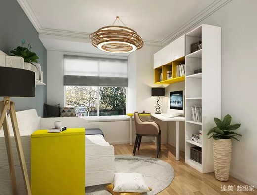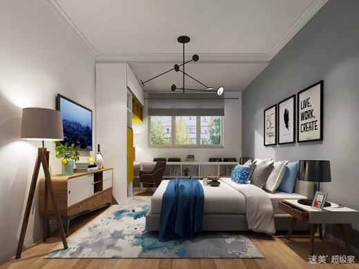 灰白黃的色彩搭配與客廳相呼應(yīng)。主臥帶電視并與書房一體化設(shè)計,同時滿足看書觀影是大多數(shù)年輕人的需求?臻g里的每一個物件,都力求質(zhì)感和追求完美,不管是藍灰搭配的床品還是木質(zhì)燈架的落地燈,許多細節(jié)之處都在體現(xiàn)著居住人精致的生活品位,透著一股溫馨愜意的居室之感。