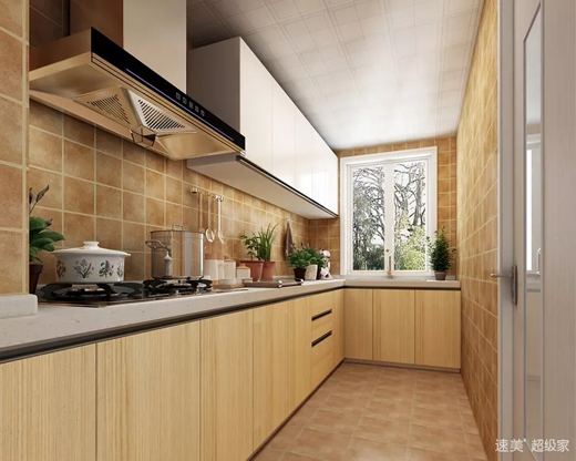 一字型廚房搭配原木色的櫥柜地板,提亮了空間通透度。整體空間規(guī)劃合理有序,使得操作起來井然有序。