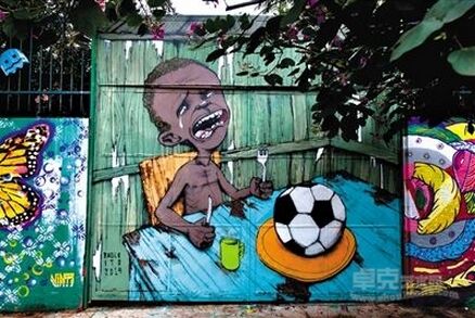 除了這些知名的“涂鴉藝術(shù)家”之外,里約的大街小巷到處都可以看到個性的涂鴉,有的詼諧幽默,有的嘲諷譏誚,有的宣揚正義,有的發(fā)泄不滿,也有的表達情感。其中最著名的莫過于2014年在巴西舉行的國際足聯(lián)世界杯賽時,巴西人民對于政府花費巨資舉辦世界杯的不滿,巴西街頭藝術(shù)家保羅·伊圖(Paulo Ito)在一所學校的墻上畫下的肖像:一個饑餓并哭喊著的孩子手拿刀叉,而眼前的盤子里卻只有一個足球。這是何等的震撼!這不正是藝術(shù)的力量引發(fā)社會關(guān)注的典例嗎?這當然并非巴西藝術(shù)家第一次利用涂鴉藝術(shù)傳達社會或政治信息。