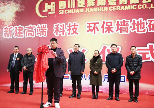 中央夾江縣委書記龔德勤先生宣布四川建輝陶瓷有限公司新建 3 條高端科技環(huán)保墻地磚生產(chǎn)線點火,成為首批退城入園、貫徹執(zhí)行無污染、高科技環(huán)保墻地磚的先進陶瓷企業(yè)。