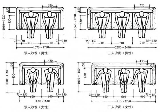 一般來說,個(gè)人沙發(fā)寬度為70~90cm,進(jìn)深為80~100cm;雙人沙發(fā)通常的寬度在157cm~172cm,三人沙發(fā)則是228cm~244cm。