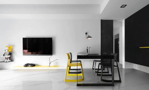 開放式的公共空間,如客廳,以低調(diào)內(nèi)斂的黑白為基調(diào),搭配小件鮮亮的黃色軟裝,能瞬間打破黑白的冷靜,營造一種活力十足的摩登時尚感。