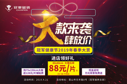 掀起鉅惠風暴的冠軍磁磚工廠大集采活動即將于4月21日再度來襲,就在這一天,由冠軍磁磚總部主辦的“大款來襲 大肆放價”冠軍健康節(jié)2019春季大促將在昆山啟動。勁爆低價簡直停不下來!更有驚喜豪禮瘋狂大派送!你準備好了嗎?鳥語花香,春意盈盈在這和煦的四月天,唯冠軍和鉅惠不可辜負……