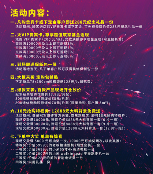本次冠軍磁磚的開倉行動,不僅有勁爆的低價優(yōu)惠,更有超乎想象的品質(zhì)保障,重新詮釋品質(zhì)生活的內(nèi)涵與意義。而作為大力度優(yōu)惠的大集采活動,到底有哪些不同以往的超級福利呢?七重開倉大禮,讓我們?yōu)槟灰唤視?