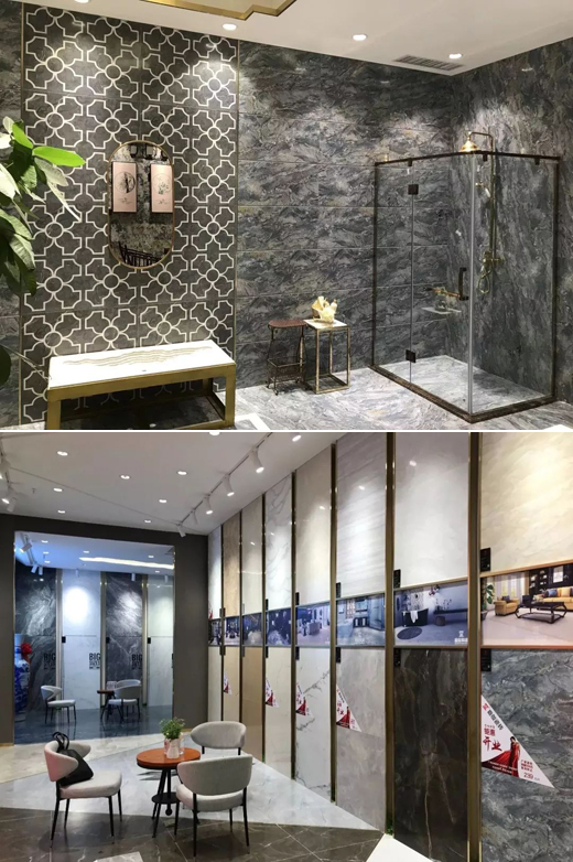 店內(nèi)展示嘉俊瓷拋石,通體為石、表里如一,以及900×1800mm的柔光大板,浩然大氣。