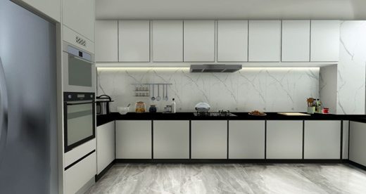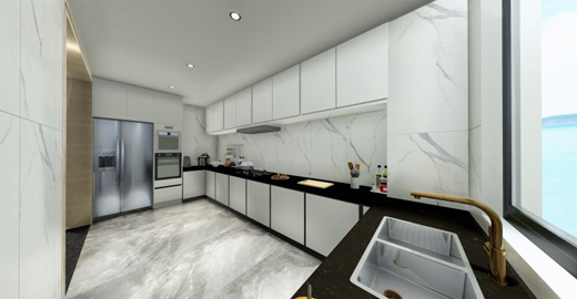 開放式的廚房,廚房地磚跟客餐廳地面磚一體,這種應(yīng)用,進(jìn)一步拓寬了視覺的延展性,使整個空間顯得更加寬敞。