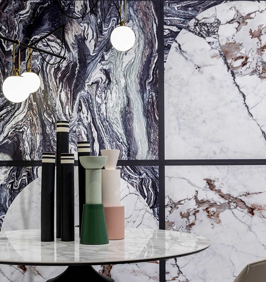 如今,與使用這些材料相關(guān)的大量記憶獲得了新的生命,在Policroma系列板材中的大理石表面和Marmorino石膏顏色的迷人圖案集中得到了獨(dú)特的解釋:大型瓷磚表面成為空間的一部分,大理石表面的精致“地理位置”或石膏圖案中的微妙顏色漣漪被放大,不間斷的連續(xù)或由嚴(yán)峻的黑暗外圍框架限定。