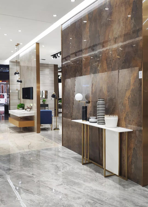 主過道的一軸線設(shè)計與連紋大板的結(jié)合,延伸視覺效果,同時將樣板間與選材區(qū)進行了合理的劃分,簡約不累贅。