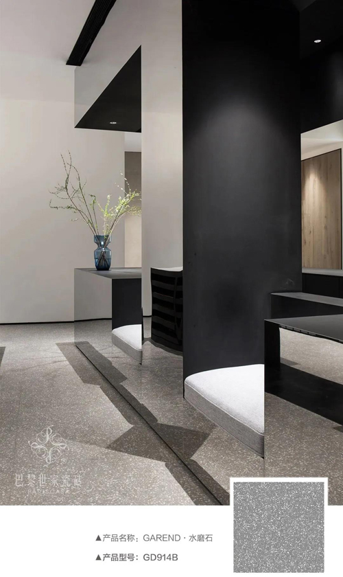 如影隨形,虛實相扣,在鏡面倒影之上,水磨石的個性姿態(tài),一覽無余地呈現(xiàn),用在細碎斑斕詮釋的時尚,給予空間無限可能。