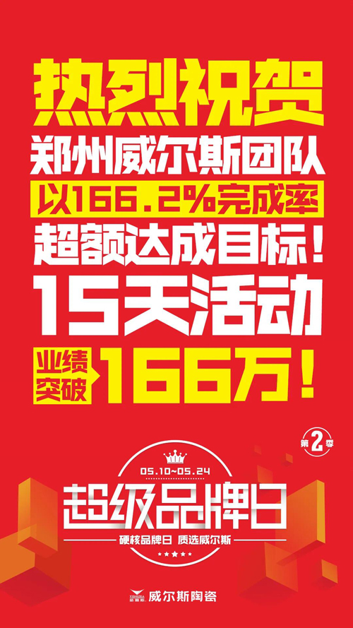 五月,作為建材行業(yè)傳統(tǒng)的旺季,隨著五一節(jié)假日的結(jié)束,建材市場熱度稍微回暖。盡管如此,威爾斯人始終相信,“不努力就是淡季,努力就是旺季“。5月10日,威爾斯總部再度攜手鄭州威爾斯團隊,舉行【超級品牌日】(第2季)促銷活動,以火爆之勢,席卷鄭州市場,再創(chuàng)業(yè)績高峰。15天活動銷售業(yè)績突破166萬!以166.2%完成率超額達成目標!