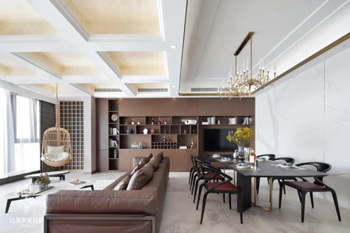 極具輕奢高雅的燈飾,靠墻定制櫥柜、豐富的收納空間,同棕色系卻又不同的材質(zhì)的家具,打破了空間的單調(diào)感,彰顯室內(nèi)別具一格的審美格調(diào)。