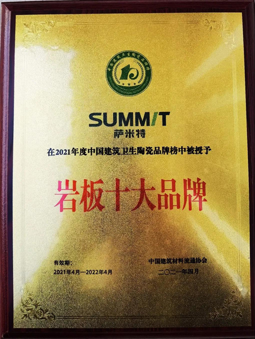2019年,巖板風(fēng)潮再次興起,薩米特抓住機(jī)遇,布局巖板市場(chǎng),創(chuàng)新生產(chǎn)大規(guī)格、多花色巖板,受到廣大消費(fèi)者的一致認(rèn)可,會(huì)上,再次斬獲重量級(jí)獎(jiǎng)項(xiàng):“巖板十大品牌”。