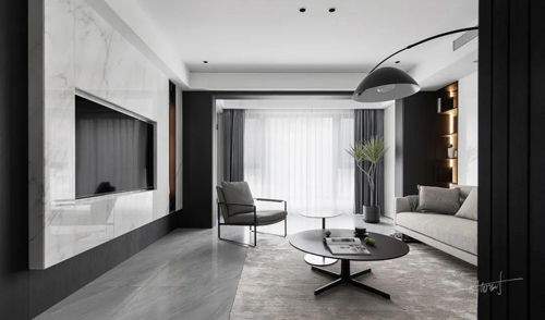 本案例沒有濃重耀眼的色彩和精雕細琢的造型,巧妙運用柔光質(zhì)感帶來的柔和、平衡,帶來視覺與家居的舒適感,利用黑白灰打造空間層次,多種質(zhì)感元素拼湊,和諧兼容地構(gòu)筑空間的品質(zhì)感。