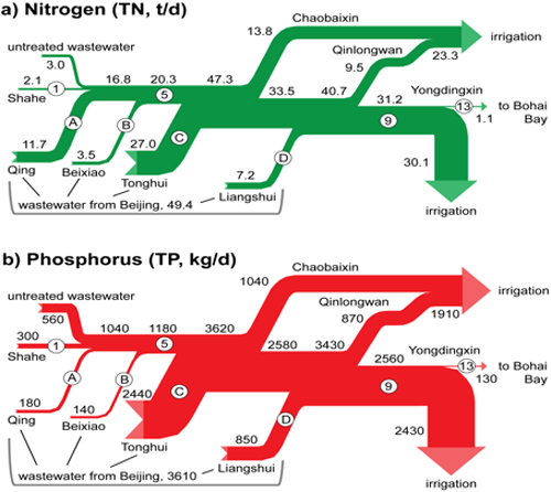 確定入河污染負(fù)荷。分析溫榆河干流水量特征,總結(jié)發(fā)現(xiàn)干流入河污染負(fù)荷污染來源較為單一,點(diǎn)源污染是最主要的污染來源;支流輸入的污染負(fù)荷主要來自污水處理廠排水,分別占入河總COD的69%和總氨氮的77%。