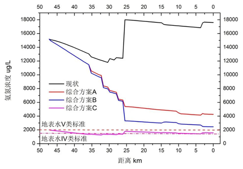 基于上述研究成果,課題組以氨氮為目標(biāo),采用QUAI2k水質(zhì)模型對(duì)溫楡河水質(zhì)改善的綜合實(shí)施途徑進(jìn)行情景分析。對(duì)照現(xiàn)狀,情景分析包括綜合方案A、B、C,1)方案A:干流污染源全部進(jìn)行截污,建設(shè)3個(gè)旁路離線河流凈化器,河道比硝化速率提高至0.2,藺河溝、清河、壩河三條支流入河口的氨氮濃度削減至5 mg/L;2)方案B:在方案A的基礎(chǔ)上,藺河溝、清河、壩河三條支流的氨氮濃度削減至2 mg/L;3)方案C:在方案B的基礎(chǔ)上,將沙河水庫(kù)氨氮控制為2.0 mg/L。結(jié)果表明,綜合方案C將會(huì)對(duì)溫榆河干流的水質(zhì)改善起到積極作用。