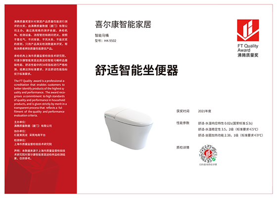 質(zhì)量“奧斯卡”權(quán)威性獎項,喜爾康“金獎”品質(zhì)獲行業(yè)高贊家居行業(yè)殿堂級獎項——沸騰質(zhì)量獎,是由6大協(xié)會\質(zhì)量團(tuán)體指導(dǎo),沸騰質(zhì)量數(shù)據(jù)主辦,紅星美凱龍、采筑電商平臺協(xié)辦,19家指定質(zhì)檢機(jī)構(gòu)檢測。組委會秉持客觀、嚴(yán)謹(jǐn)、公正的態(tài)度,嚴(yán)格依據(jù)對應(yīng)品類領(lǐng)域的國家標(biāo)準(zhǔn)(或國際標(biāo)準(zhǔn)、行業(yè)標(biāo)準(zhǔn))作為測評依據(jù),標(biāo)準(zhǔn)整體上高出國標(biāo)和部分行業(yè)標(biāo)準(zhǔn)要求,依據(jù)產(chǎn)品檢測真實質(zhì)量數(shù)據(jù)進(jìn)行公平、公正評獎,獎項含金量高,所獲獎的產(chǎn)品受到行業(yè)的認(rèn)可及市場的肯定。2021年度測評中,共有200余家國際國內(nèi)主流家居品牌的500余款產(chǎn)品參與測評。喜爾康能夠從中脫穎而出,一舉斬獲五項大獎,特別榮獲最高獎項——沸騰質(zhì)量金獎,是組委會對喜爾康產(chǎn)品實力的權(quán)威認(rèn)可,更是對喜爾康產(chǎn)品品質(zhì)的強(qiáng)有力背書!用數(shù)據(jù)說話 喜爾康智能馬桶技術(shù)水準(zhǔn)領(lǐng)跑行業(yè) 在本屆沸騰質(zhì)量評選中,喜爾康衛(wèi)浴共有1款產(chǎn)品榮獲“沸騰質(zhì)量金獎”,獲獎產(chǎn)品為智能馬桶HK-9530;2款產(chǎn)品獲得“沸騰質(zhì)量標(biāo)桿獎”,分別為智能馬桶HK-919獲舒適智能坐便器標(biāo)桿獎,智能馬桶P503獲節(jié)能智能坐便器標(biāo)桿獎;2款產(chǎn)品獲得“沸騰質(zhì)量單項獎”,分別為智能馬桶HK9502獲舒適智能坐便器,智能馬桶P310獲節(jié)能智能坐便器。各項性能指標(biāo)卓越出眾,憑借高標(biāo)準(zhǔn)質(zhì)量脫穎而出。舒適性能和節(jié)能性能是消費者在選購智能馬桶時最為關(guān)注的重點之一,尤其水溫穩(wěn)定性更是直接關(guān)系到清洗時的舒適度。在質(zhì)檢專家的專業(yè)檢驗中,喜爾康HK-9530的水溫穩(wěn)定性達(dá)國家標(biāo)準(zhǔn)2級,表現(xiàn)出色,能夠?qū)崿F(xiàn)舒適清洗的如廁體驗。另外,喜爾康HK-9530的坐圈加熱功能以2.14℃的指標(biāo)達(dá)到了國家1級標(biāo)準(zhǔn)。同時,該款產(chǎn)品獲得2021紅點獎,設(shè)計理念遠(yuǎn)超同行,達(dá)到國際頂尖水平。