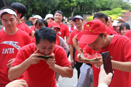有放不大開(kāi)的伙伴,咬一口細(xì)細(xì)品味,急壞了身后的伙伴,有的顧不上顏值和形象,捧起西瓜就拼命啃,噴射的瓜汁濺起陣陣笑浪,累積的疲憊一掃而空!