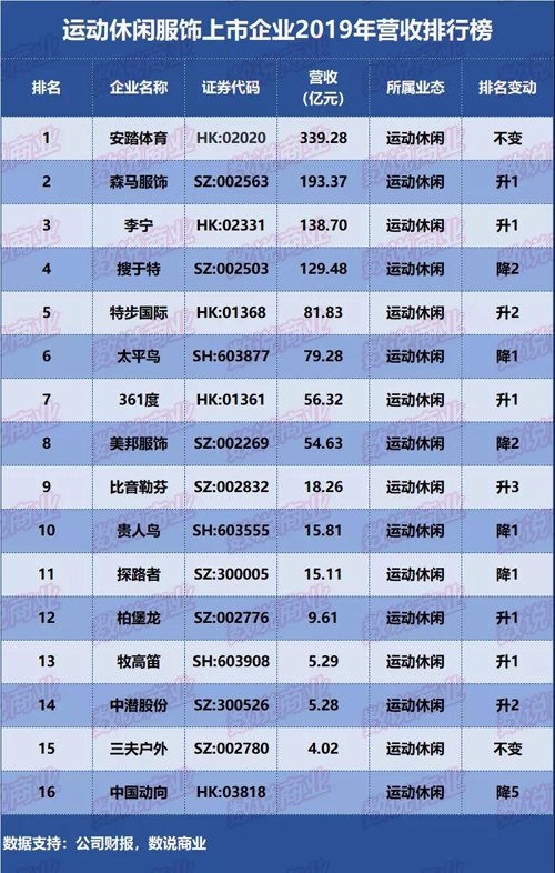 國內上市運動休閑服飾、男裝品牌去年營收排位出爐,泉州企業(yè)安踏體育高居運動休閑服飾上市企業(yè)排行榜首位,特步、361度、貴人鳥同時躋身十強;在男裝榜單上,七匹狼(5.240, 0.08,1.55%)位居第5,九牧王(9.060, 0.10, 1.12%)排名第8。運動休閑服飾上市企業(yè)2019年營收排名據統(tǒng)計,15家運動休閑服飾上市企業(yè)2019年營收總額為1146.27億元,較去年同期的1045.10億元,增加101.17億元,同比增加9.68%。安踏體育位居榜首,特步、361度、貴人鳥分列第5、第7、第10。
