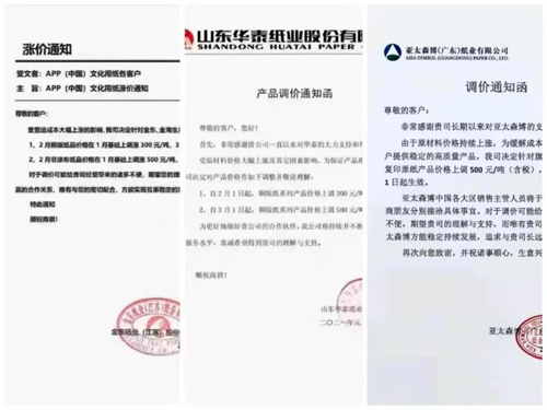 品觀APP發(fā)現(xiàn),進(jìn)入1月以來,國(guó)內(nèi)有近20家紙企接連發(fā)布漲價(jià)通知函,其中不乏華泰紙業(yè)、晨鳴集團(tuán)、亞太森博、APP紙業(yè)等在內(nèi)的多家行業(yè)龍頭。