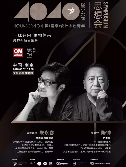 由廣州設計周主辦,云上設計師俱樂部作為南京運營機構(gòu)執(zhí)行,鷹牌陶瓷作為戰(zhàn)略合作伙伴的40UNDER40 中國(南京)設計杰出青年(2018-2019)思想會&萬物新品品鑒會即將于2018年9月2日在大報恩寺恩劇場舉行。本次活動特邀上海朱永春設計有限公司(KARLCHU)設計總監(jiān)朱永春先生和當代水墨畫探索藝術家 陳鐘先生,屆時兩位嘉賓會帶來關于設計與藝術兩個互相關聯(lián)領域的主題分享,把他們的故事一同帶給你。
