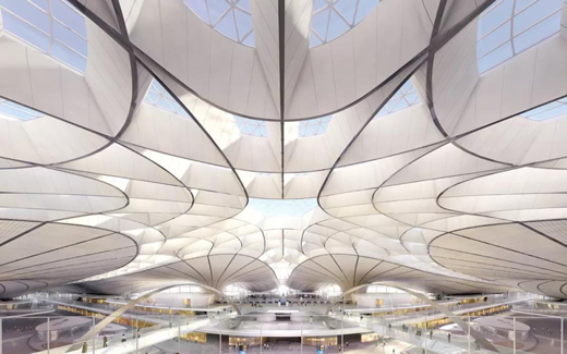 曾被英國《衛(wèi)報(bào)》評(píng)選為“新世界七大奇跡”之首,大興機(jī)場的屋頂面積相當(dāng)于25個(gè)足球場那么大。屋頂中心有一個(gè)巨大六邊形天窗與六條條形天窗、八個(gè)氣泡窗相互連接將機(jī)場內(nèi)部變成一個(gè)大型光庭。